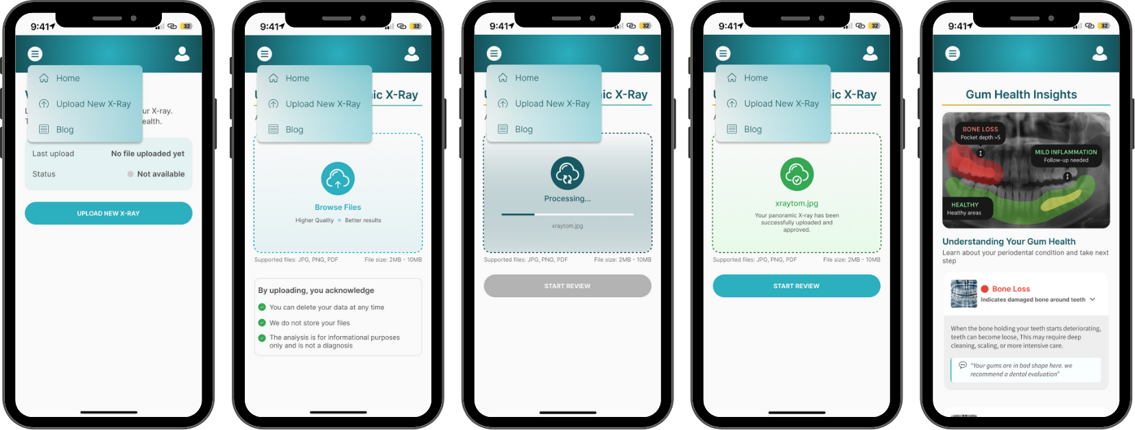 Perio AI is a mobile-app designed to help dental professionals and patients better understand gum health using AI-powered analysis of 2D dental panoramic X-rays. The platform generates easy-to-understand reports with visual overlays, empowering patients to take proactive steps toward healthier gums. Our mission is to bridge the gap between clinical expertise and patient understanding through accessible technology.